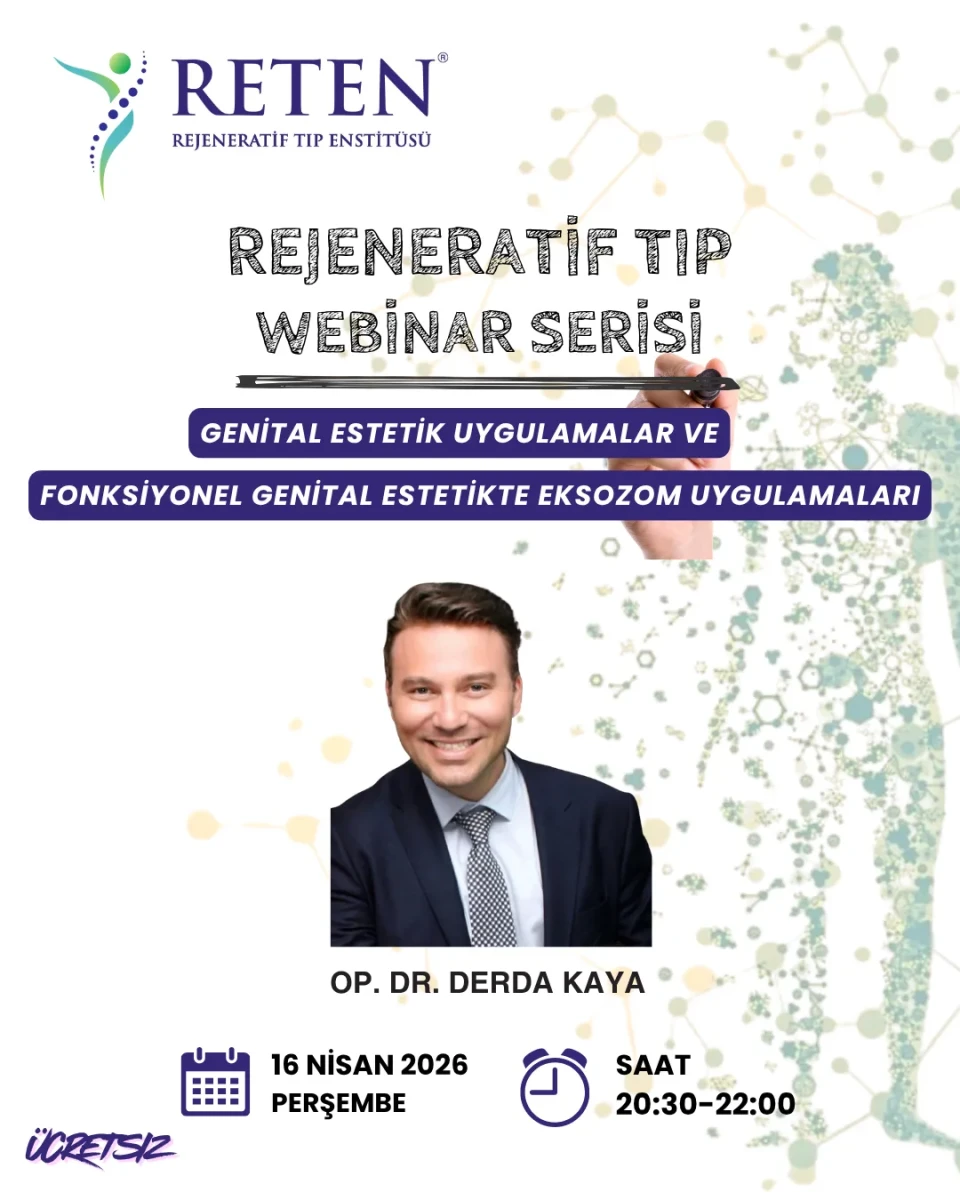 Webinar serimiz kapsamında gerçekleştirilen bu oturumda, Op. Dr. Derda Kaya “Genital Estetik Uygulamalar ve Fonksiyonel Genital Estetikte Eksozom Uygulamaları” başlıklı sunumuyla katılımcılarla buluştu.